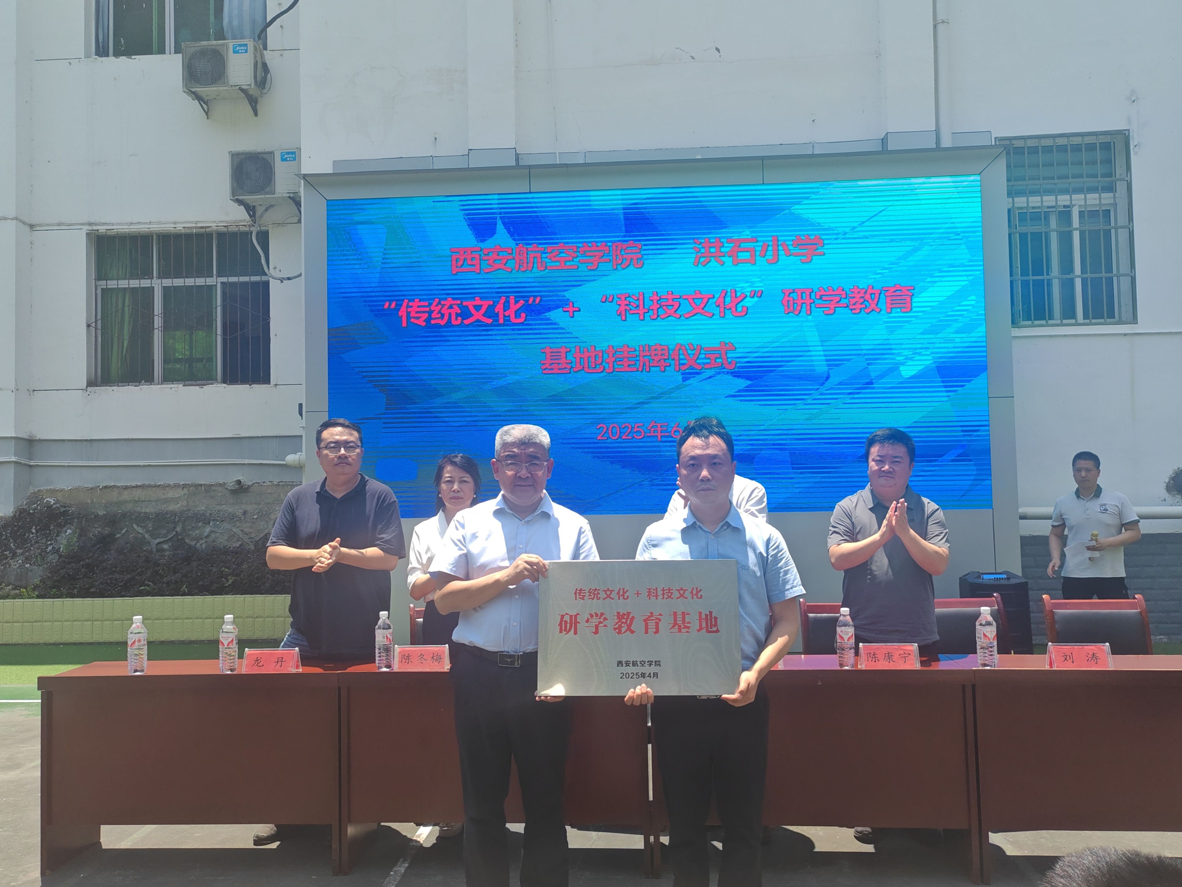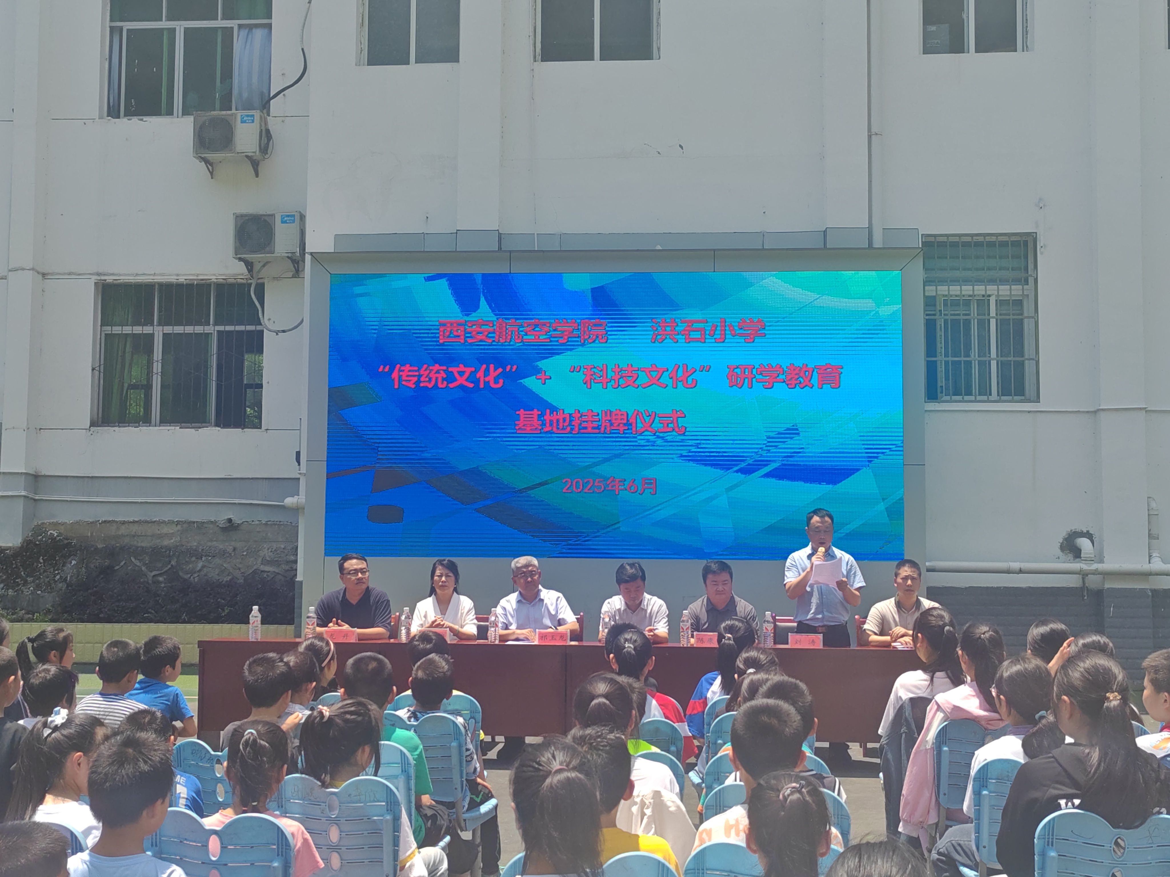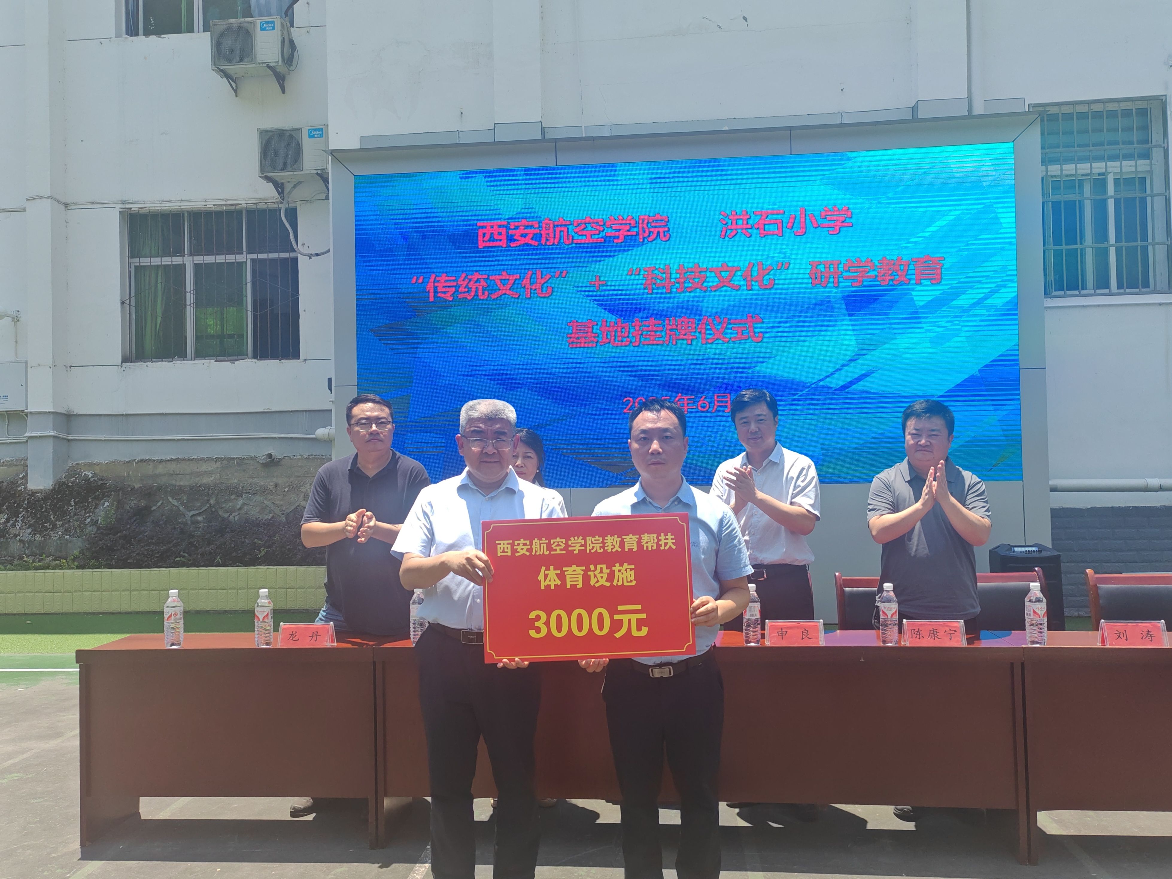 仪式上,祁玉龙代表学校向洪石小学授予了“传统文化”+“科技文化”研学教育基地牌匾,捐赠了由我校体育部帮扶的2套羽毛球教学设施。