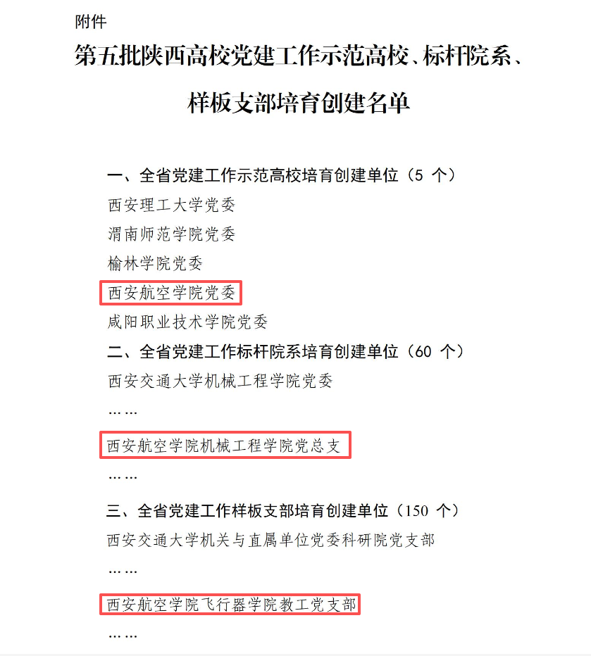 近日,中共陕西省委教育工作委员会公布第五批陕西高校党建工作培育创建名单。我校党委入选“全省党建工作示范高校”培育创建单位。同时,我校机械工程学院党总支入选“全省党建工作标杆院系”、我校飞行器学院教工党支部入选“全省党建工作样板支部”培育创建单位,标志着我校党建工作迈入了全省高校第一方阵,为庆祝学校七秩华诞再献贺礼。