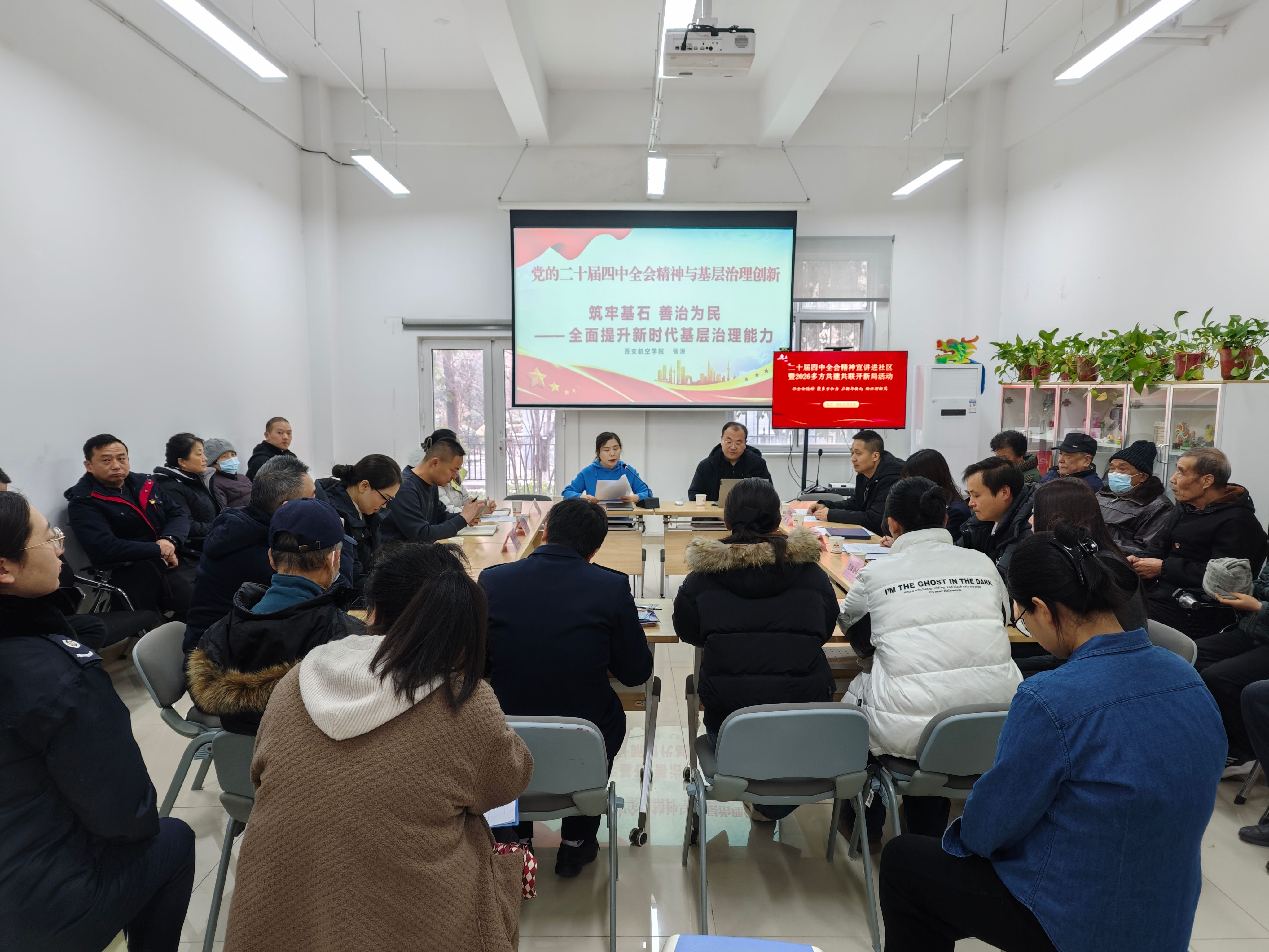 为深入推进校地党建合作,推动党的二十届四中全会精神深入基层、走进群众,1月21日,我校联合阎良区航空一路社区、西安市税务局航空基地分局、航空基地科创中心等单位,共同开展“党的二十届四中全会精神宣讲进社区”活动。马克思主义学院张涛副教授以《筑牢基石 善治为民——全面提升新时代基层治理能力》为题,为社区居民带来一场深入浅出的理论宣讲。